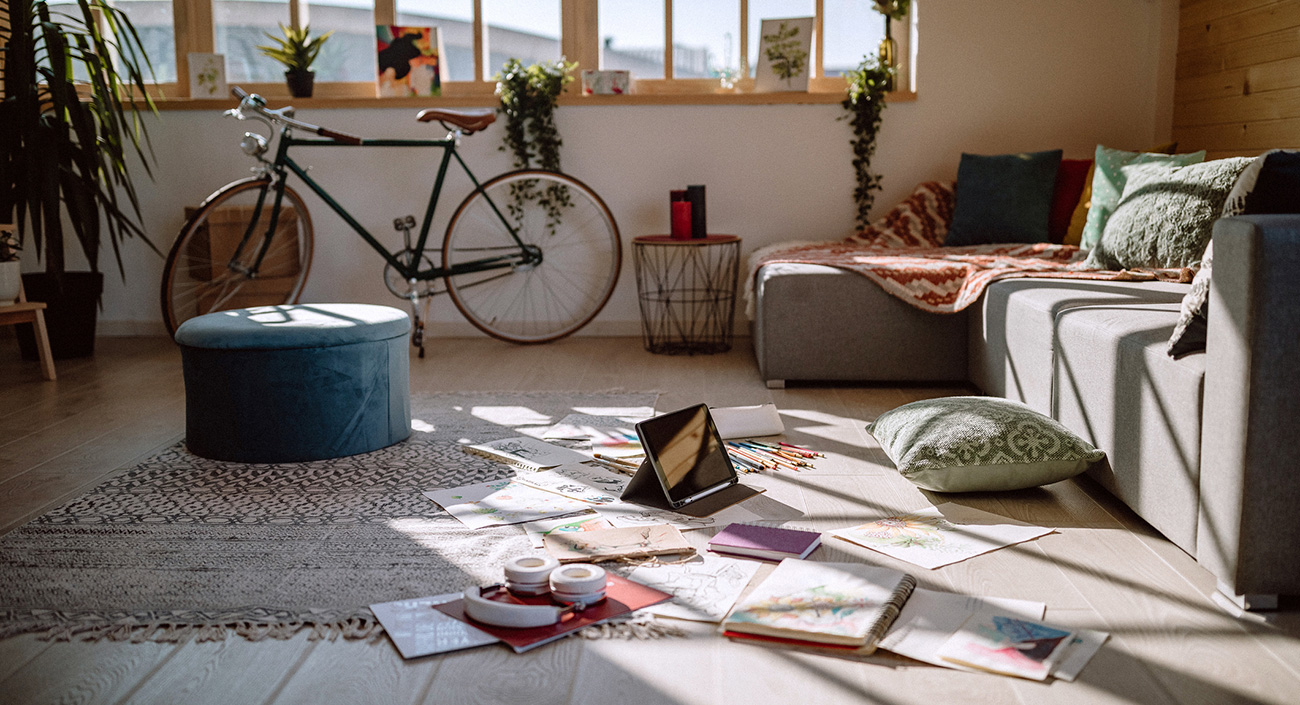 Die Wohnung ist bunt und sehr kreativ eingerichtet. Die Möbel sind teils aufgebaut, teils noch verpackt. Es gibt viele Kunstobjekte und angefangene Bastelarbeiten zu sehen.